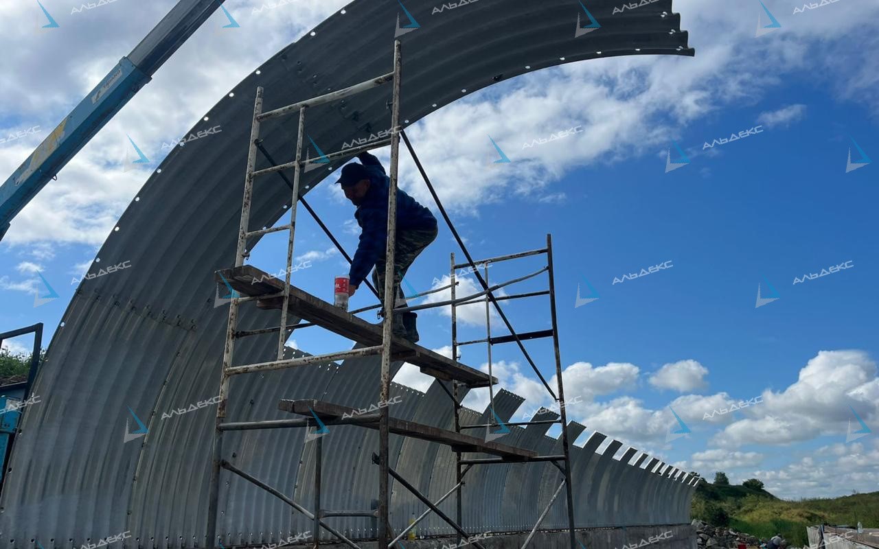 Арка из листов гофрированной трубы ЛМГ представляет собой сборную конструкцию, выполняемую из отдельных сегментов, соединённых болтовыми стыками.