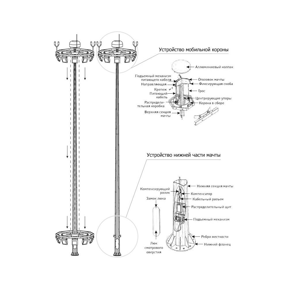 ВГМ-16 конструкции, выполняемые из листового проката с применением современных методов автоматической сварки, позволяющих получить максимально надежный сварной шов. При этом металлоконструкция имеет минимум точек напряжения, что позволяет ей сохранять вертикальное положение в различных условиях. Важным конструкционным элементом системы является мобильная корона, устройство которой позволяет отказаться от больших затрат на обслуживание сложных высокомачтовых опор и значительно расширить географию их применения.